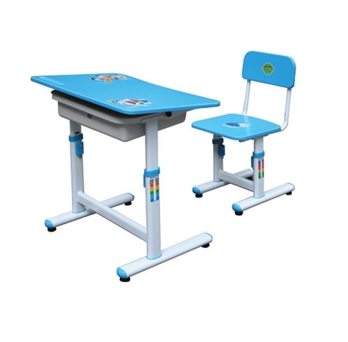 - Bàn học sinh gia đình có thể điều chỉnh độ cao. Mặt bàn, đệm tựa gỗ phủ sơn PU có hình con giống. Khung bàn sử dụng ống thép.